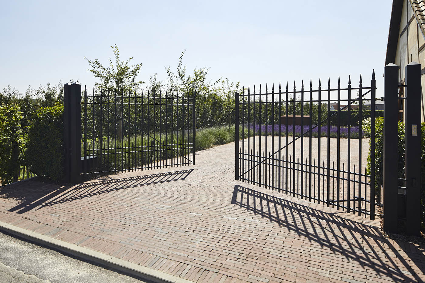 De vleugelpoort Amsterdam werd ontworpen in een traditionelere sfeer. In plaats van strakke vormen worden de spijlen van deze poort afgewerkt met metalen sierpunten. De detailering van deze draaipoort zijn te bespreken.